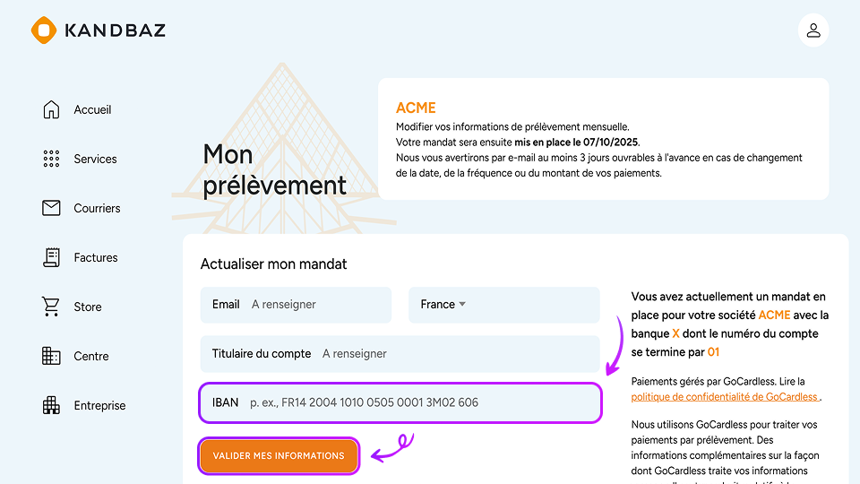 💡 En résumé : Kandbaz n’enregistre pas de carte bancaire. Le paiement s’effectue par prélèvement SEPA, que vous pouvez modifier facilement depuis votre espace client en mettant à jour votre RIB.